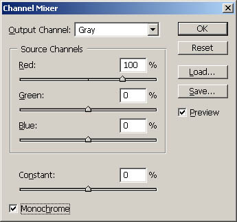 source channel to 100% red. Check on the monochrome box in the lower left.