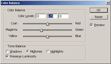 Fine Tune Inkjet Prints on Watercolor PaperMay, 2005Arches, Fabrian, Windsor Newton and others make some of the worlds finest papers. Watercolor papers such as Arches Bright White have a high degree of internal and external sizing, helping your prints from becoming dull from the ink absorbing into the paper more than you would like. There are however a few problems associated with using them.... - They exhibit a "classic" green bias that I have seen from the earliest days when printing on uncoated cotton paper. - The d-max is less than a print on a paper with an ink-jet coating. In other words, blacks are not as black as they can be. - Metamerism issues seem worse than with coated stock. Under daylight, the green effect is strongest, under tungsten light, not so bad. So... try this... Set your printer driver to Premium Luster Paper for a heavier ink laydown Make a test print using a 21 step grayscale. You can see color bias more easily. Before printing, add magenta to the image using the slider in the color balance dialog box. IMAGE>ADJUSTMENT>COLOR BALANCE or CTRL>B. Use a color adjustment layer, if you prefer. Experiment with different amounts in units of 5, between 5 and 40. Apply to mid-tones only.