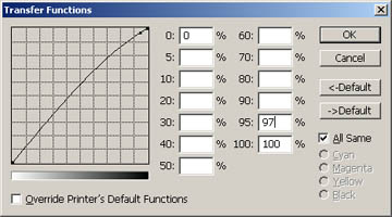 Remember that you'll need one value for daylight, one for tungsten... and another one for fluorescent light. Before printing, add a transfer curve to darken the values from 50 - 95%... FILE>PRINT WITH PREVIEW Click on show more options, choose the transfer button. In the tranfer curve dialog box, make the 95% value 97% and let the rest of the curve drift upward.