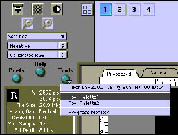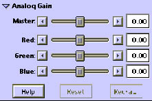 7. Below the settings drop down menu at the top of the dialog, choose either negative for film, or positive for slides. Then choose Calibrated RGB for color film (or slides) or choose grayscale for black and white film. If you are scanning color film with the intension of printing a black and white image later, scan in color anyway. When you scan in grayscale, it only uses the red channel. You can do a better job of converting to grayscale yourself in Photoshop. 8. Click the preview button and the scanner previews the image in the scanner window. It takes about a minute for the preview to appear. 9. If the shadows are too dark, or the highlights are too light, twirl down the Analog Gain triangle in Tool Palette 1. Move the Master Gain slider to the right (positive values) to lighten, or to the left (negative values) to darken the scan. Push the preview button again to see the result. Don't be afraid to experiment to get the results you want. See illustration below.