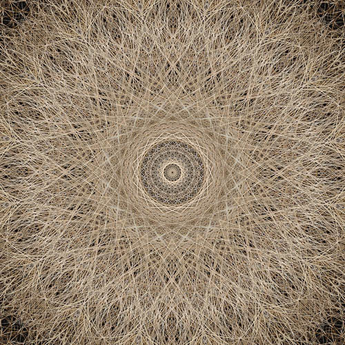 This spring I explored even more intracate radial designs using dried Bermuda Grass found in my yard in March before the new browth began. Mirroring, copying, rotating, layering the initial image allow simple beginnings to become quite complex. Radial symmetry design forms the organizing principle in ancient Buddhist and Hindu mandalas, which have spiritual significance. The Sanskrit word mandala means “that which encircles a center.” The Romans echo the concept in the oculus of the Pantheon, and this symmetry is also found in medieval Christian art, such as the spectacular rose windows at Chartres, Notre Dame, and Strasbourg cathedrals and the illuminations of the 12th century mystic Hildegard von Bingen. The 20th-century psychoanalyst Carl Jung saw the mandala as “a representation of the unconscious self.” As a professor of photography, design, and pottery, I teach my students to order two- and three-dimensional space with an appreciation of this ancient understanding. I have always been drawn to a formalist approach to my image making. The visible world serves as a means to explore the language of ordered space. I find working with reflection symmetries to be immensely satisfying. The simple act of centering and finding the center is the unifying principle tying together the varied media that I teach |
