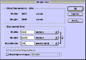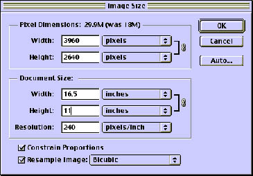 8. If the print size is too small, you can increase the Document Size of the image. Increasing the Document Size of the image, however, requires Resampling the image. Remember, upsampling adds additional pixels and downsampling subtracts pixels. Some resampling is acceptable when necessary, but it must be done with care. It is better not to downsample, but upsampling is sometimes necessary. 9. To increase image size, you can upsample, but it should be limited to a doubling of the file size (say from 6 Mb to 12 Mb). This would not appreciably degrade the final output. Upsampling more than double the file size runs the risk of compromising image quality. This is dependent, of course, on the nature of the image itself. Images with a broad tonal range and limited detail permit greater upsampling than images with very fine detail. 10. To upsample an image in Photoshop, check both the Constrain Proportions and Resample Image check boxes in the Image Size dialog and select Bicubic interpolation from the pop-up menu. Change the Width or Height of the image in the Document Size fields and the new file size appears at the top of the Image Size dialog box. See below.